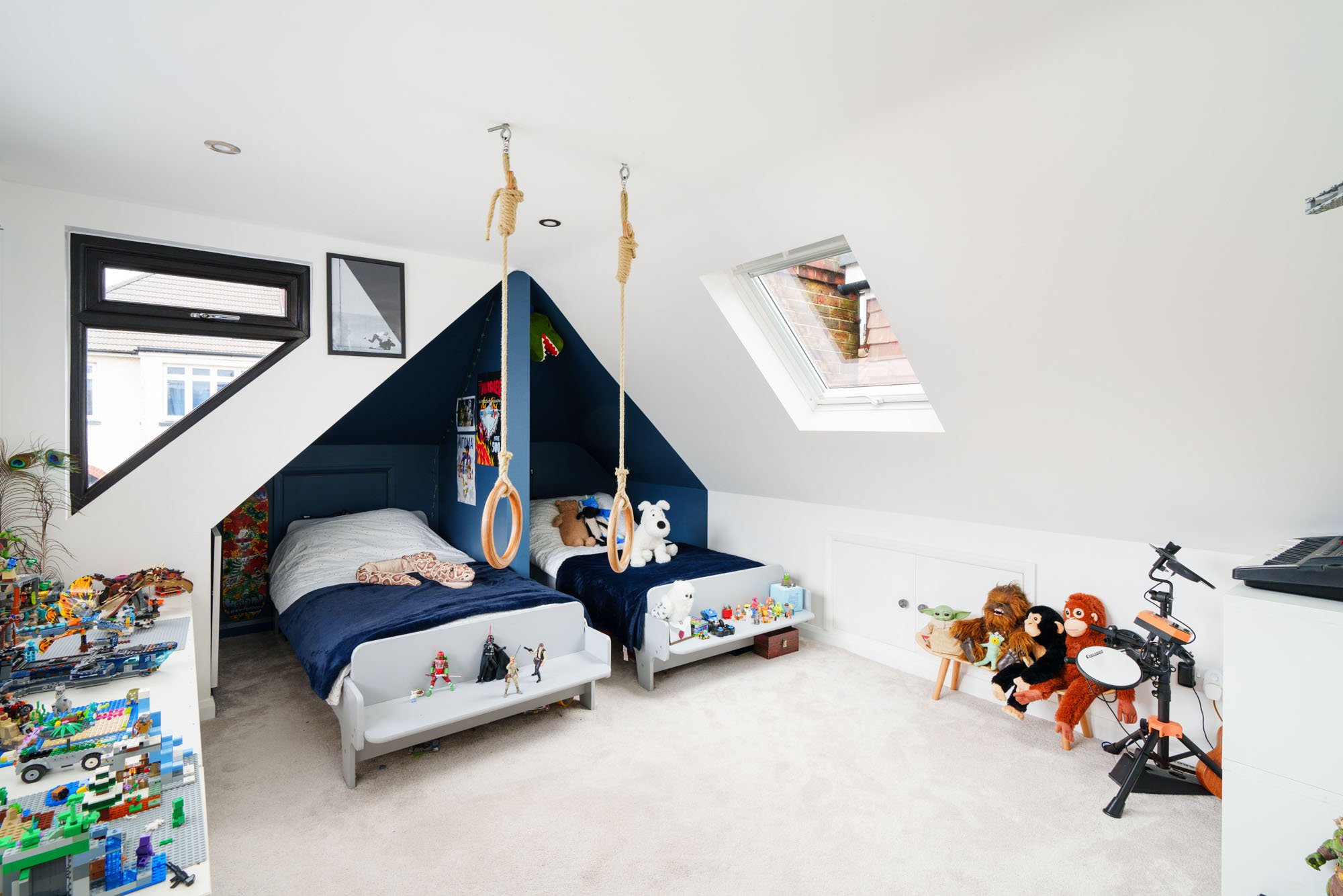 Bespoke touches to the project included a slatted timber screen to the staircase and hanging rings for the kids to swing from in their beloved new room.