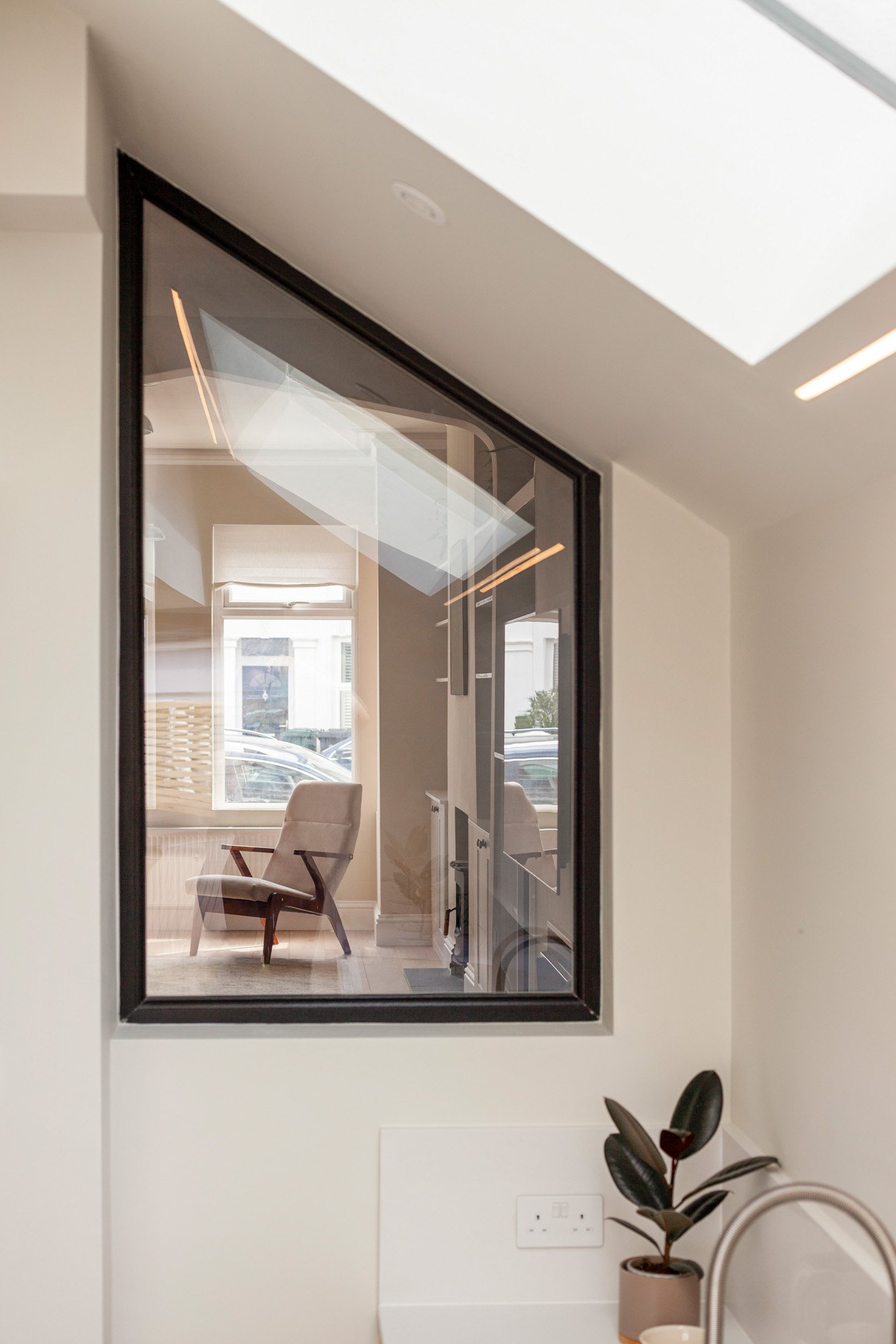 Situated in the Poet’s Corner area in Hove, our client wanted to create a new shared kitchen and dining space to their victorian terraced property. It needed to have lots of storage, whilst keeping the space light and open. To acheive this we designed a side extension that pushed out to the boundary, maximising the available footprint. A large rooflight floods light into the extension, whilst an angled internal window keeps the living room well lit from both ends of the property.