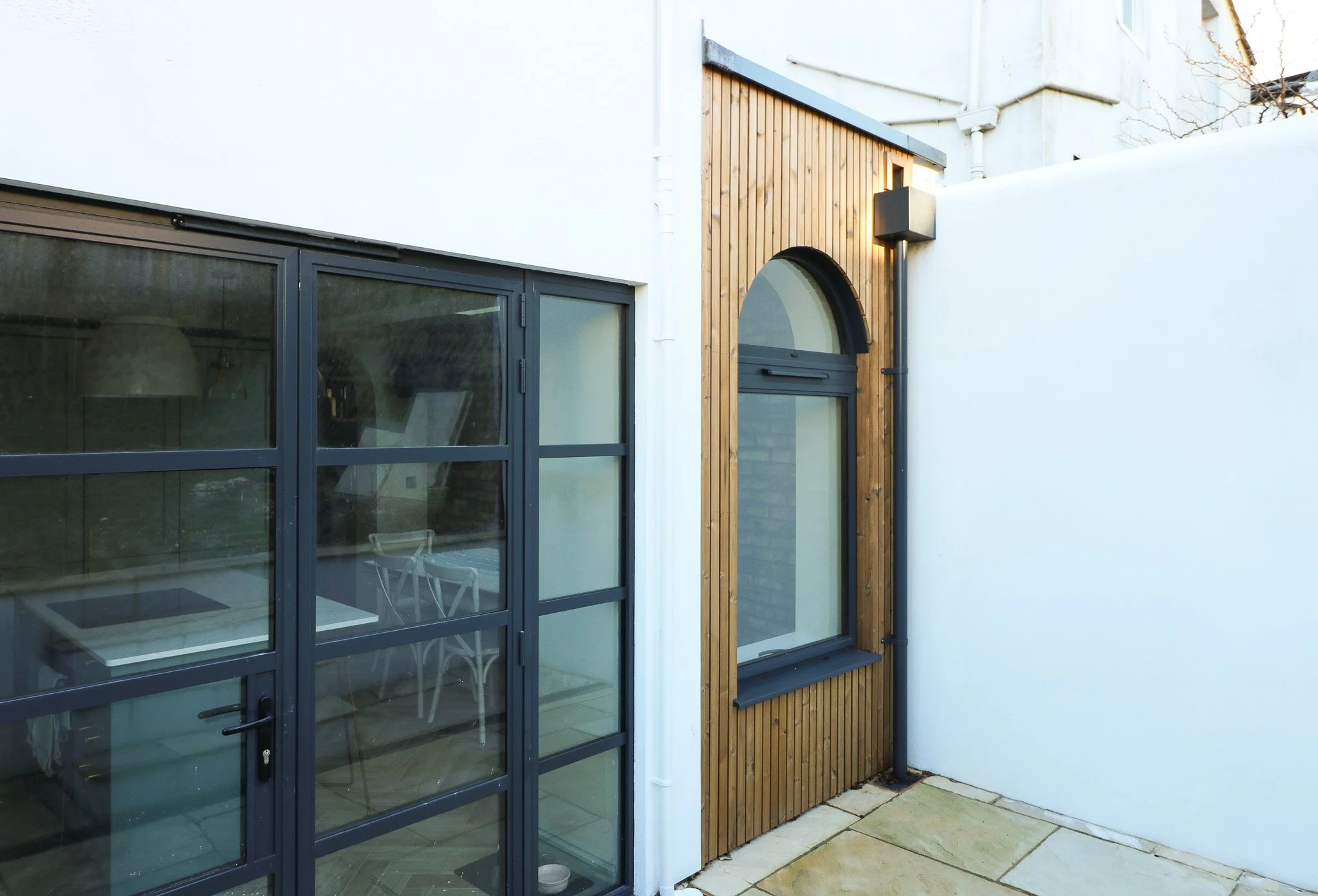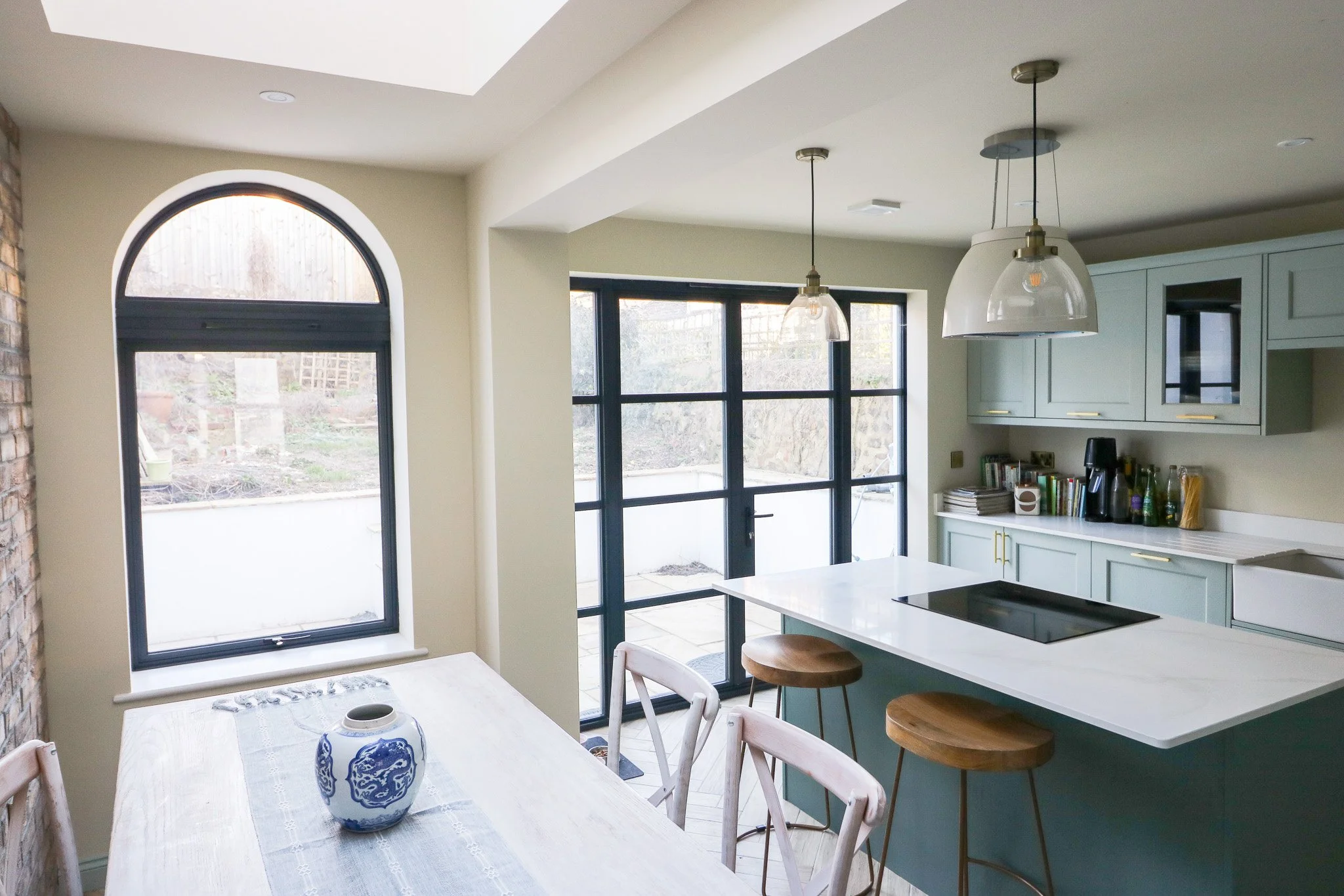 Here we have a timber clad rear infill extension, on the hills in the Hanover area. The client wanted to open up the back of the property and create a sociable shared kitchen/dining room to enjoy with her friends and family. The arched window is the main feature of the space, beautifully framing the garden.
